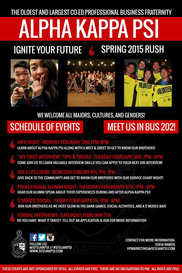 Execution of the Spring Rush recruitment campaign included t-shirt design, poster and flyer design and distribution, organizing tabling efforts, and promoting the event through social media leading up to 40+ attendees per rush event and 30+ sign ups for recruitment.